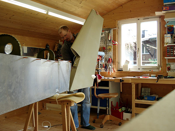 ![]() Automatic Flap Controller Rotax 9x-Series Tachometer Stereo Amplifier ![]() 18. September [-:-]: Übrigens - letzte Woche ist der Firewall-Forward-Kit von CZAW angekommen. Bald geht's also ans vordere Ende des Fliegers!!! Das Fahrwerk baue ich momentan absichtlich noch nicht ein, weil die Festigkeit meiner aktuellen GFK-Fahrwerksschwingen noch abgeklärt wird (P.S. Hat/Kennt jemand eine vernünftige nicht-lineare FEM-Software, welche ich für die Festigkeits-Simulation dieser GFK-Schwingen verwenden könnte?). 15. September [2:00]: Die Hinges am Seitenleitwerk (Alu-L-Winkel) werden montiert: Zuerst befestige ich das Seitenleitwerk am unteren Hinge, dann zeichne ich am Seitenleitwerk-Holm die Position der beiden L-Winkel am oberen Hinge ein. Die L-Winkel werden anschliessend bei demontiertem Seitenleitwerk mit A5-Nieten (4 Stück je Winkel) am Seitenleitwerk-Holm befestigen. Alles passt exakt, so richtig exakt, yeah!!! Bei einer Auslenkung nach links oder rechts schwingt das Seitenleitwerk alleine wieder in die Ruhe-Nullposition zurück, die Aufhängung scheint also ziemlich reibungsfrei zu sein. Im Moment können sich die Bolzen auch relativ zu den Aluminium-Aufhängungen ohne Messing-Bushing bewegen und deshalb diese Lager "ausleiern". An der unteren Aufhängung lässt sich der Bolzen zwischen den beiden Alu-Platten fixieren (einspannen). Am oberen Punkt geht das allerdings nicht (die oberste Alu-Platte ist am Seitenleitwerk befestigt, die unterste Platte am Rumpf!). Evtl. muss ich dort später noch Messing-Buchsen auch in den Alu-Platten auf der Seitenleitwerk-Seite einpassen. Damit sollte sich jegliches spätere Spiel vermeiden lassen.